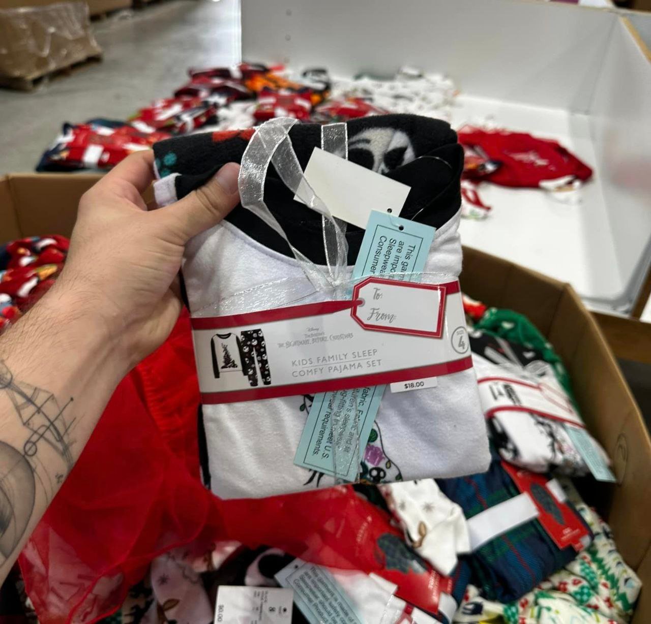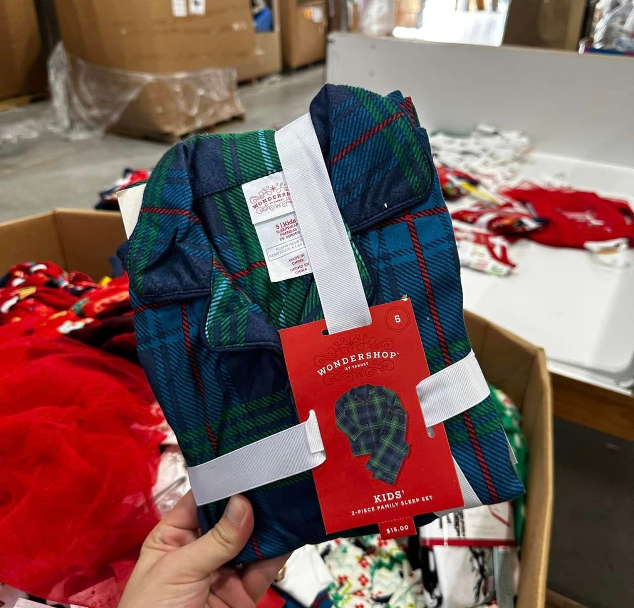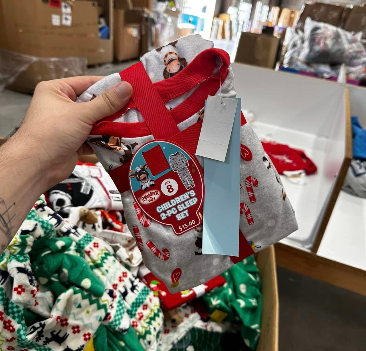Each pallet contains 500 assorted Christmas clothing items for adults and kids.